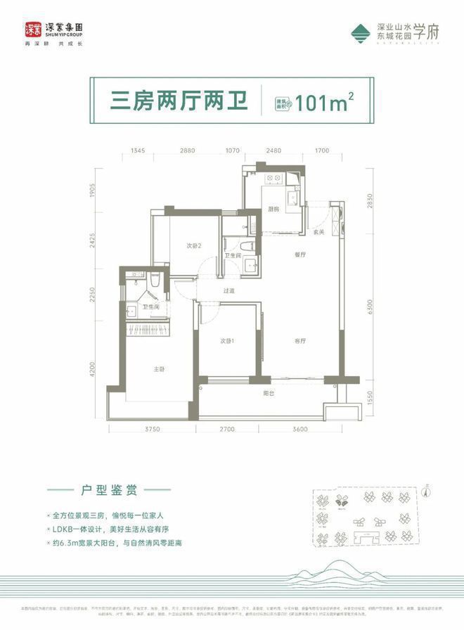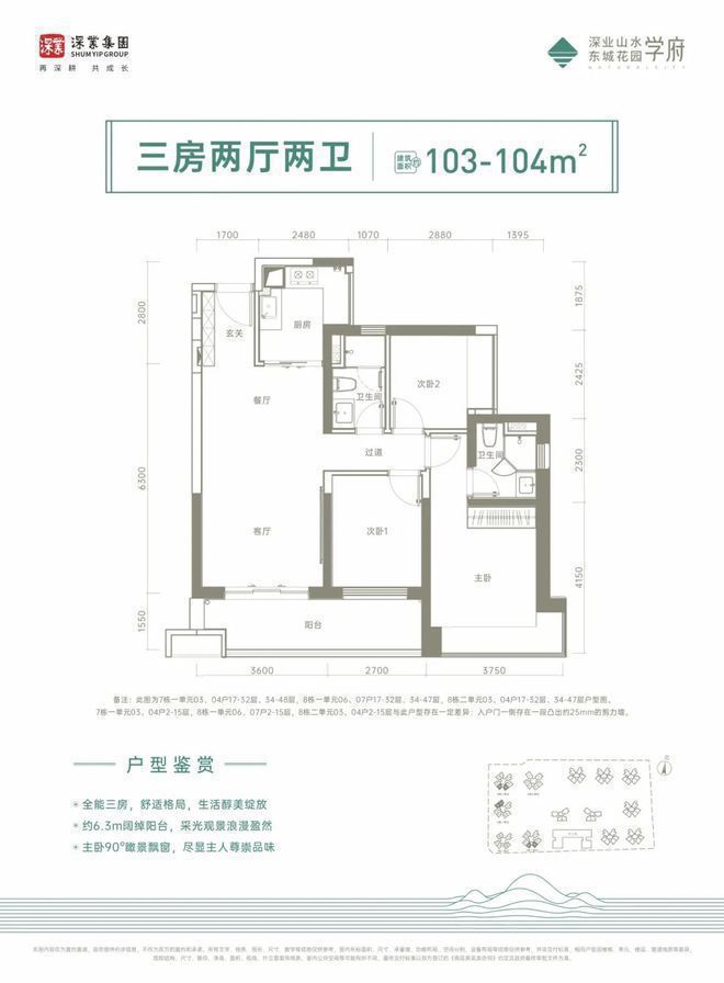 整个户型方正通透,竖厅格局。LDKB一体化设计,布局延伸到阳台视野扩增,全方位瞰景大三房,室内的通风和采光也会加强,约6.3米大阳台,拥抱自然光线与清风。